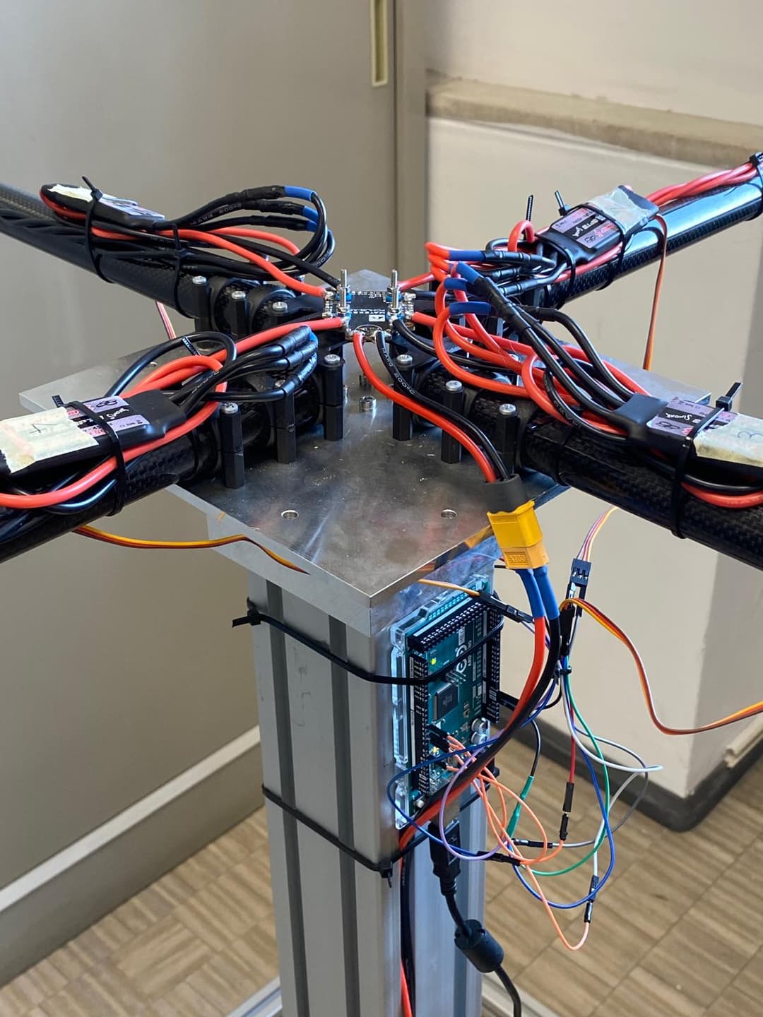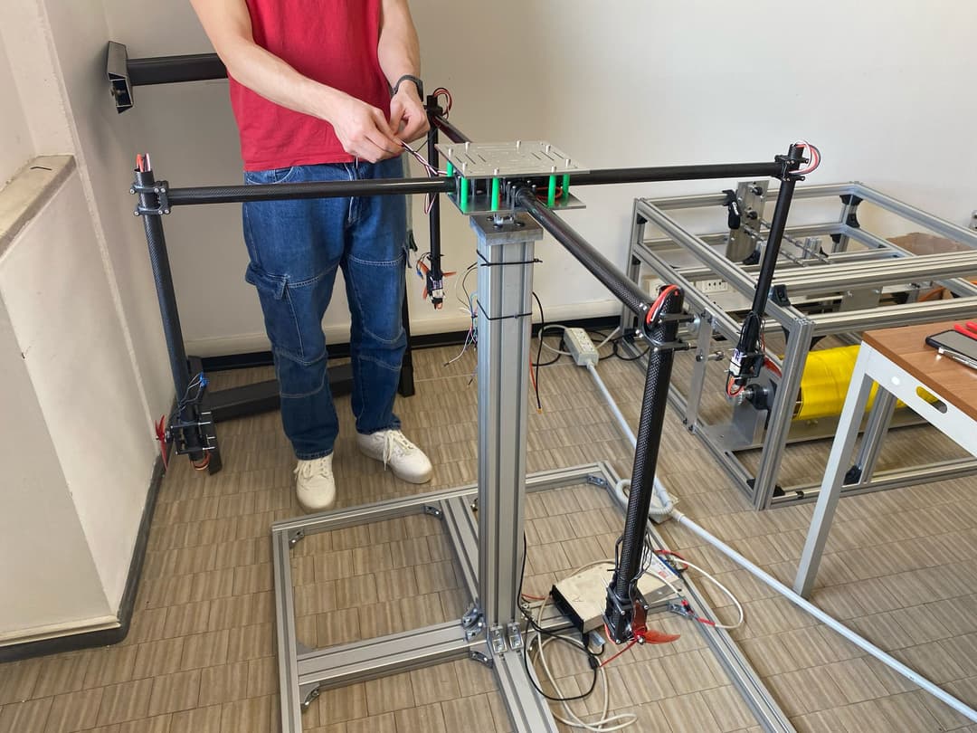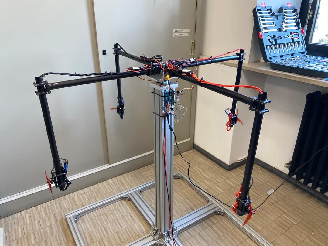 In collaborazione con il Prof. L.M. Fagiano, stiamo sviluppando una struttura attuata dedicata al test di droni di media/grossa taglia. L’obiettivo iniziale è costruire un banco sperimentale sicuro, con sensori e attuatori che permettano di simulare condizioni reali di volo in ambiente controllato.